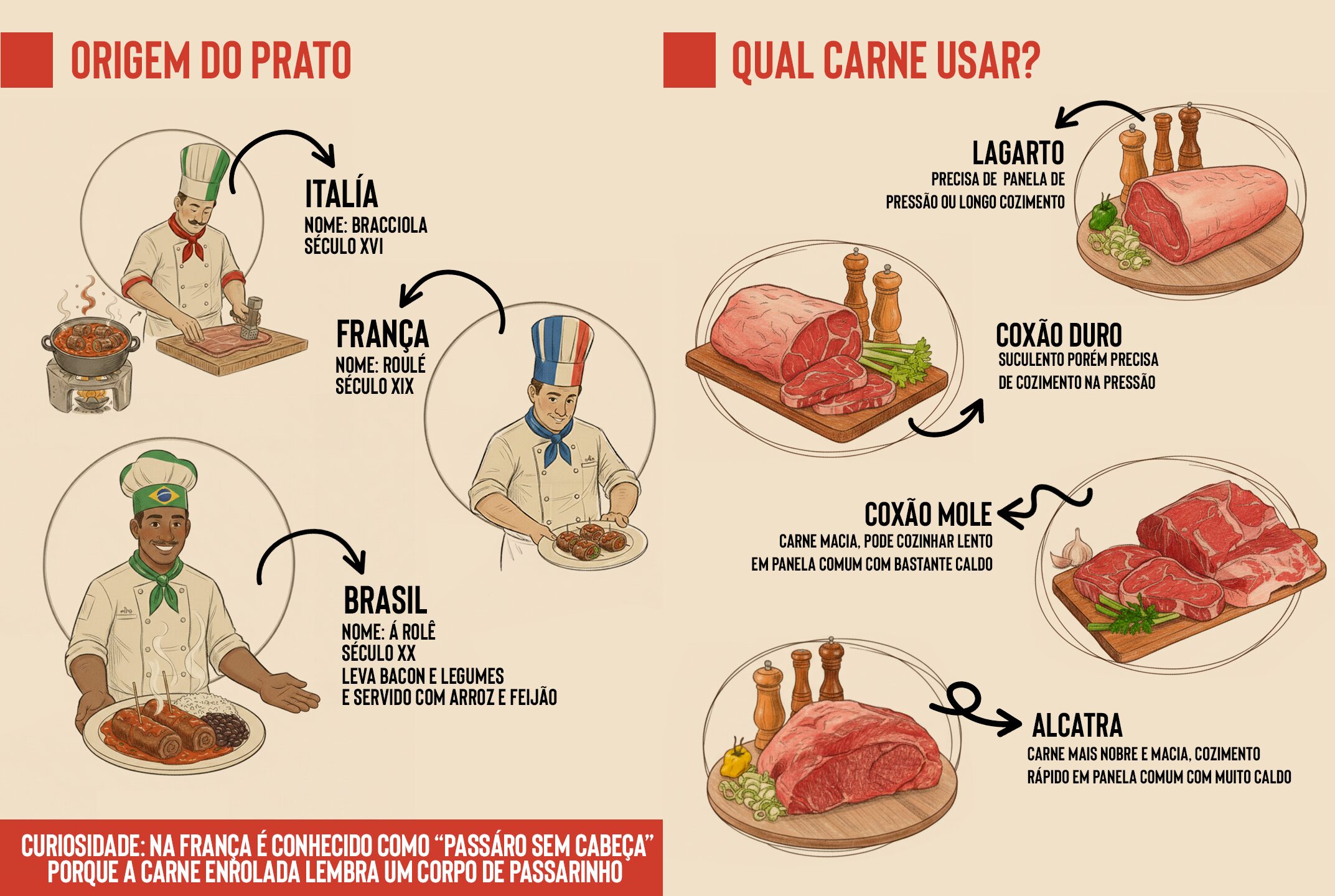 A Curiosa História do Bife à Rolê: Embora pareça um prato 100% brasileiro, o bife à rolê é um “imigrante” que se adaptou muito bem por aqui. Ele é descendente direto da bracciola italiana (ou involtini). Os imigrantes italianos trouxeram a técnica de enrolar carnes menos nobres com recheios saborosos para aproveitar melhor os cortes. Por que “à rolê”? O nome vem do francês roulé, que significa “enrolado”. Nós brasileiros apenas “aportuguesamos” o termo para o que conhecemos hoje.