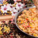 Na mesma panela, adicione o bacon picado e frite até começar a soltar gordura, junte o alho-poró, arroz, páprica doce, açafrão da terra, sal e refogue por 1 minuto.