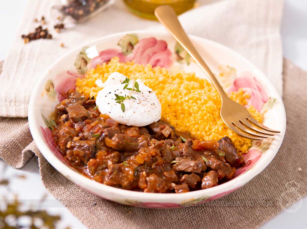 Nessa receita preparei o Picadinho com Contra Filé e servi com um cuscuz e Ovo Poché, mas você também pode utilizar Filé Mignon como na receita original e ainda adicionar acompanhamentos como farofa de ovo e até Banana a Milanesa.